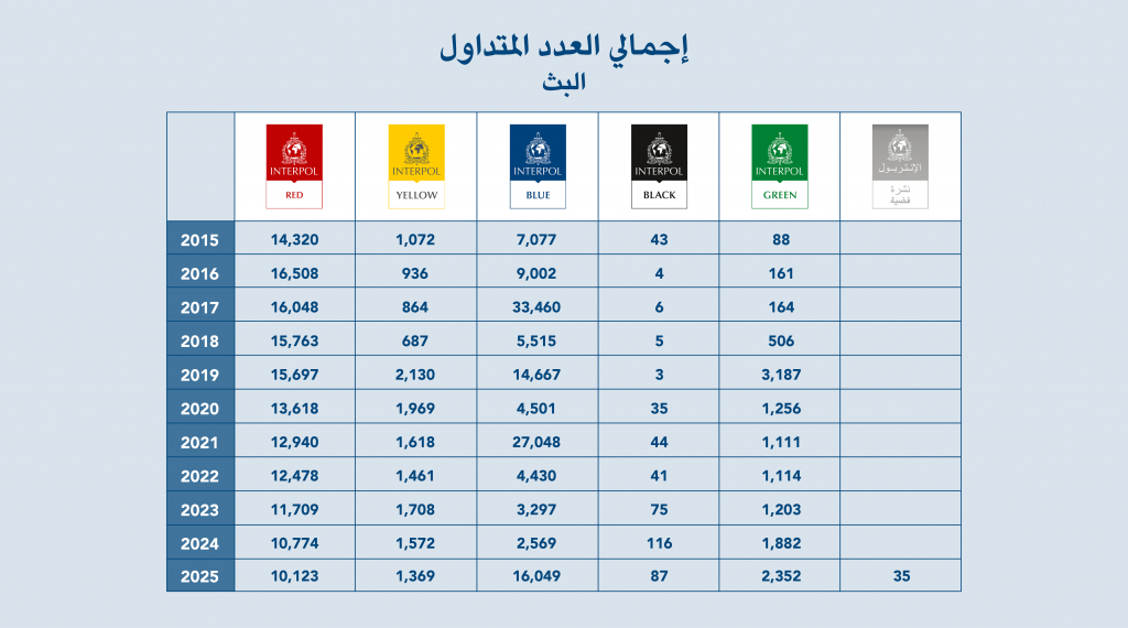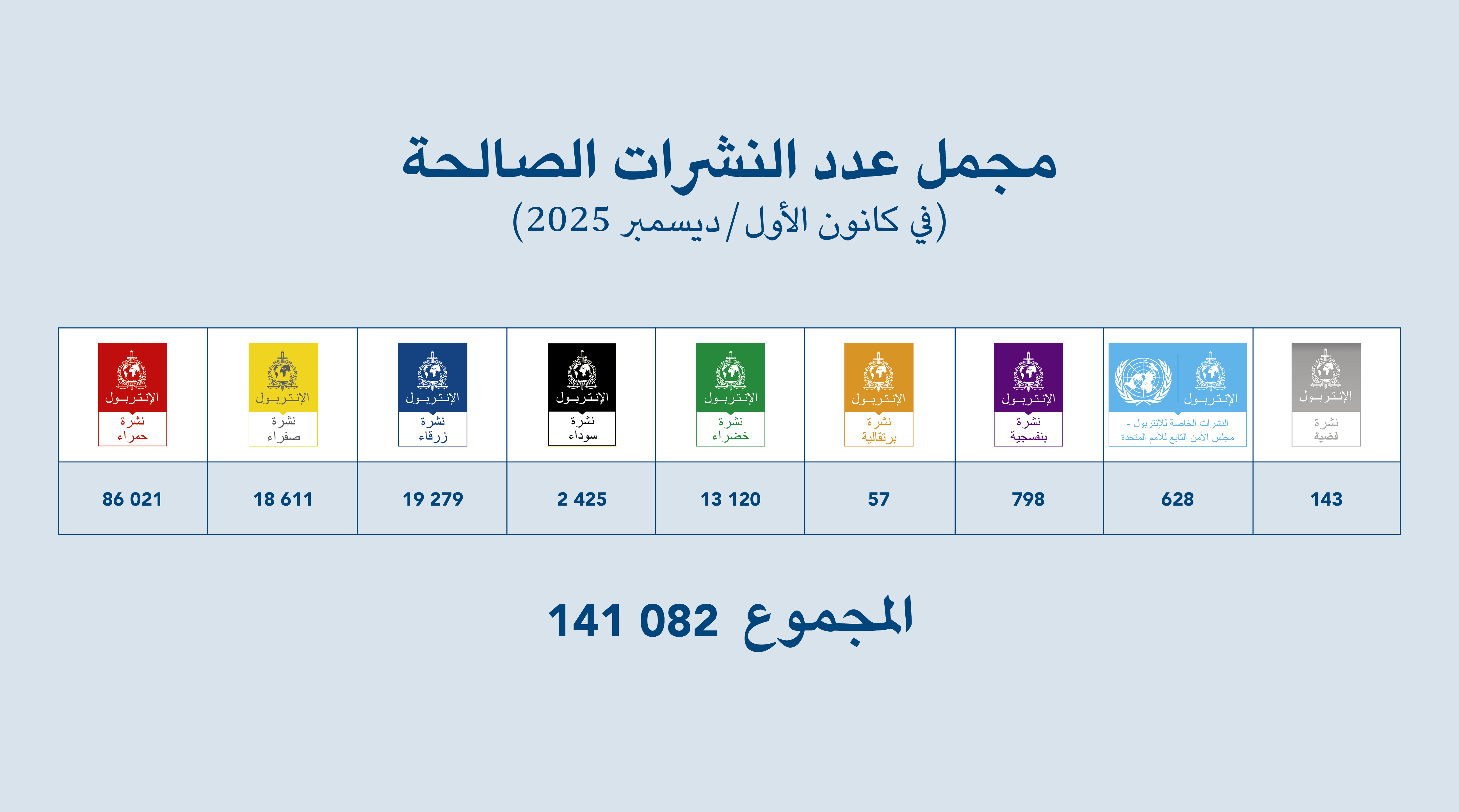 النشرة الخضراء: تصدر للتنبيه إلى الأنشطة الإجرامية لشخص يُعتبر أنه يشكل تهديدا محتملا للسلامة العامة.