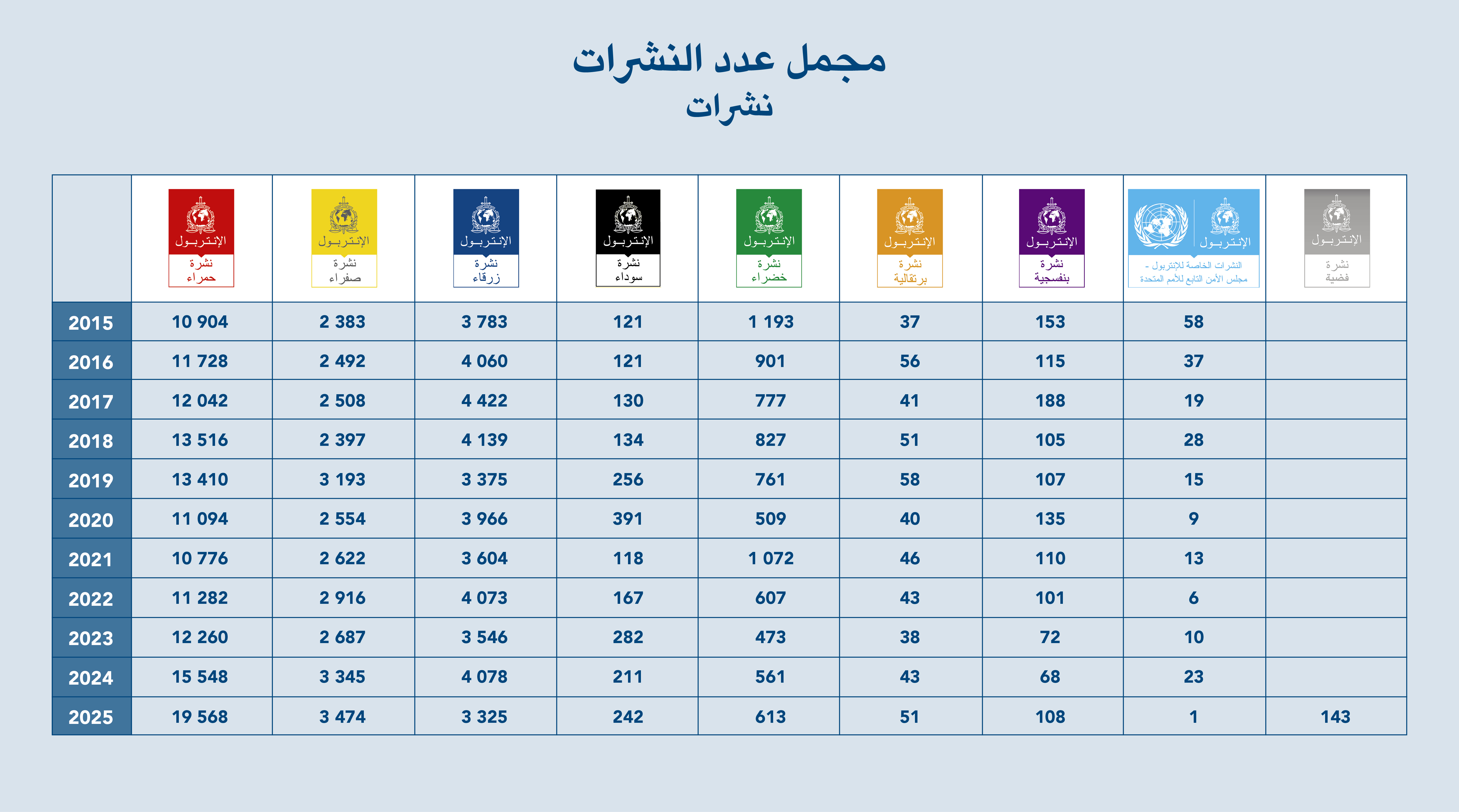 واستخدام معظم النشرات مقصور على أجهزة الشرطة فقط ولا تُتاح للعموم. ولكن، يمكن نشر مقتطفات منها على هذا الموقع إذا رغب البلد الذي طلب إصدارها في تنبيه عامة الناس أو طلب مساعدتهم. وجميع النشرات الخاصة بالأمم المتحدة متاحة للعموم.