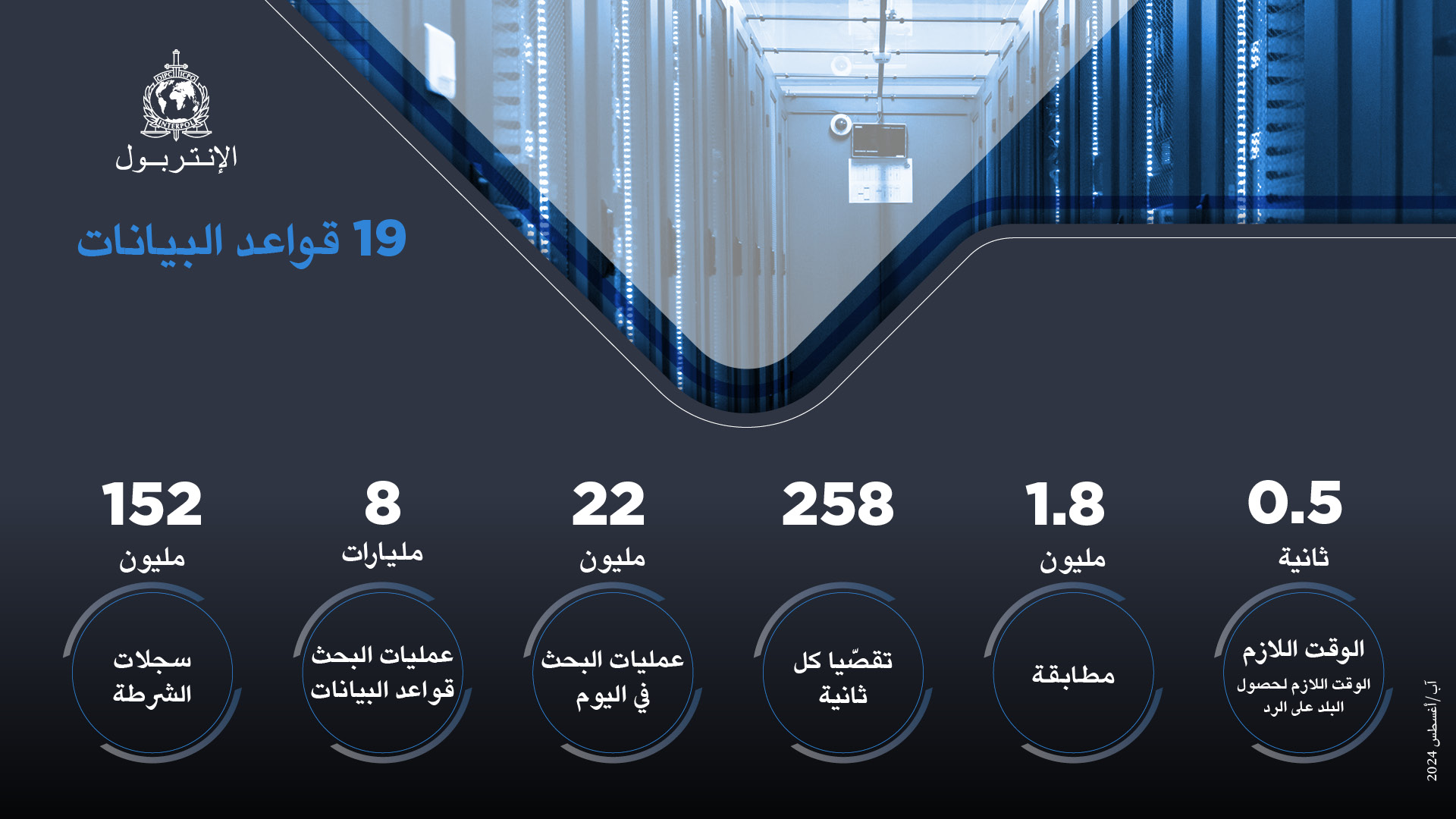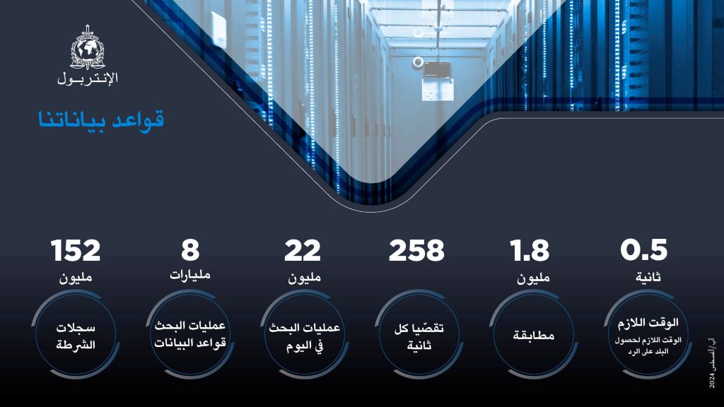 وقوعد بيانات الإنتربول متاحة عبر المنظومة العالمية للاتصالات الشرطية المأمونة I-24/7، وهي الشبكة الفنية التي تربط أجهزة إنفاذ القانون في جميع البلدان الأعضاء وتخوّل المستخدمين المرخَص لهم بتشاطر المعلومات الشرطية الحساسة والعاجلة مع نظرائهم حول العالم.