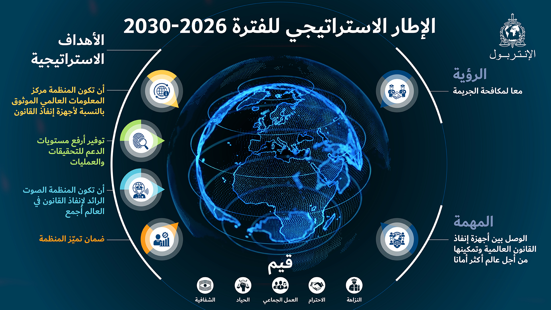ويعمل الإنتربول على إشاعة ثقافة تعاون وابتكار وثقة بين أجهزة إنفاذ القانون في بلدانه الأعضاء والوصل بينها وتمكينها ليتنسى لها الوصول إلى المعلومات والأدوات والدعم الخبرات اللازمة لإقامة مجتمع عالمي أكثر أمنا وسلامة، يمكن فيه منع الجرائم والتحقيق فيها وملاحقة مرتكبيها على نحو أكثر فعالية، ما يؤدي إلى إحداث فرق ملموس في حياة المواطنين في العالم أجمع.