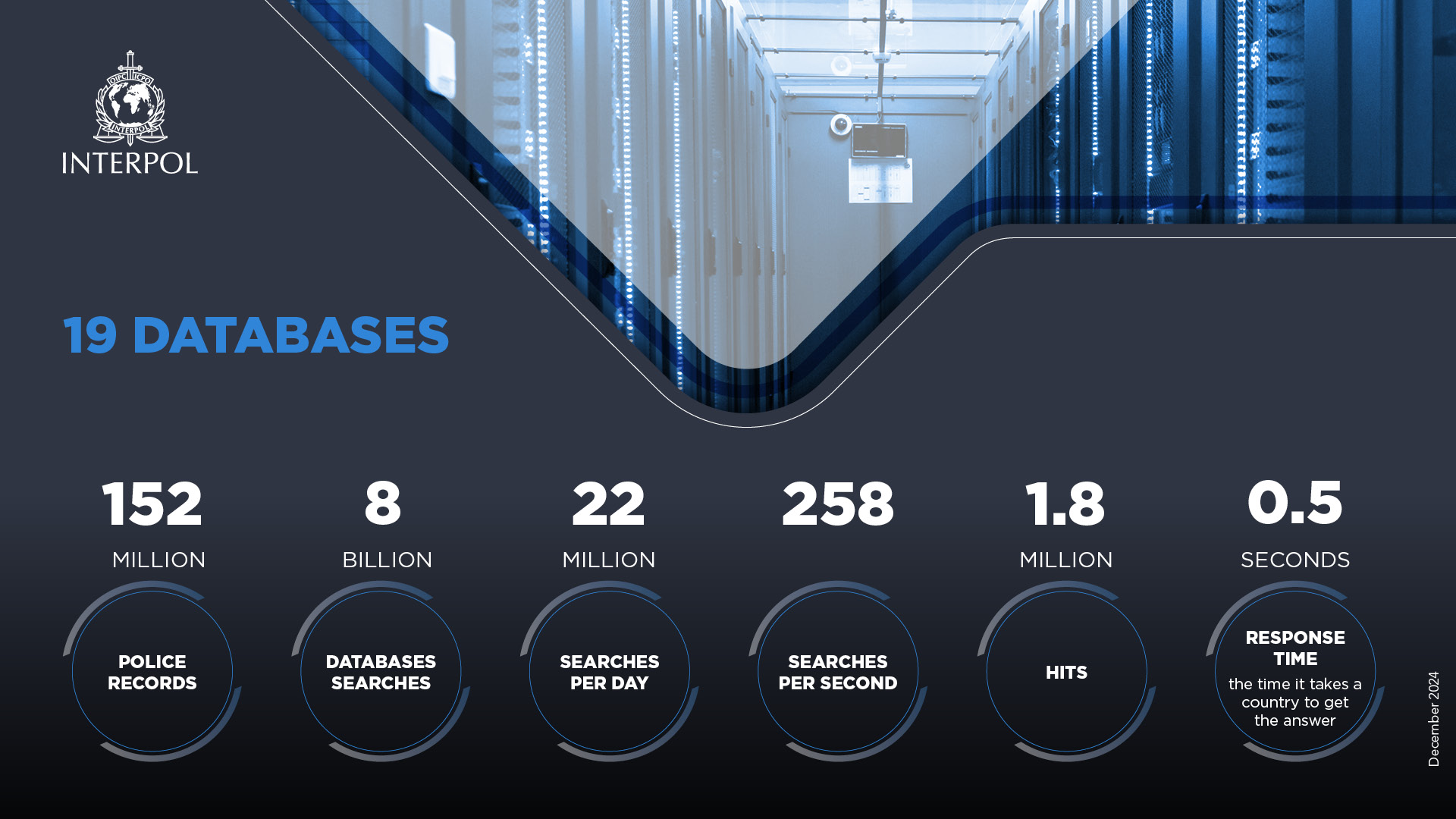 The databases contain millions of records with information on individuals such as names and fingerprints; stolen property such as passports and vehicles; and weapons and threats such as firearms.