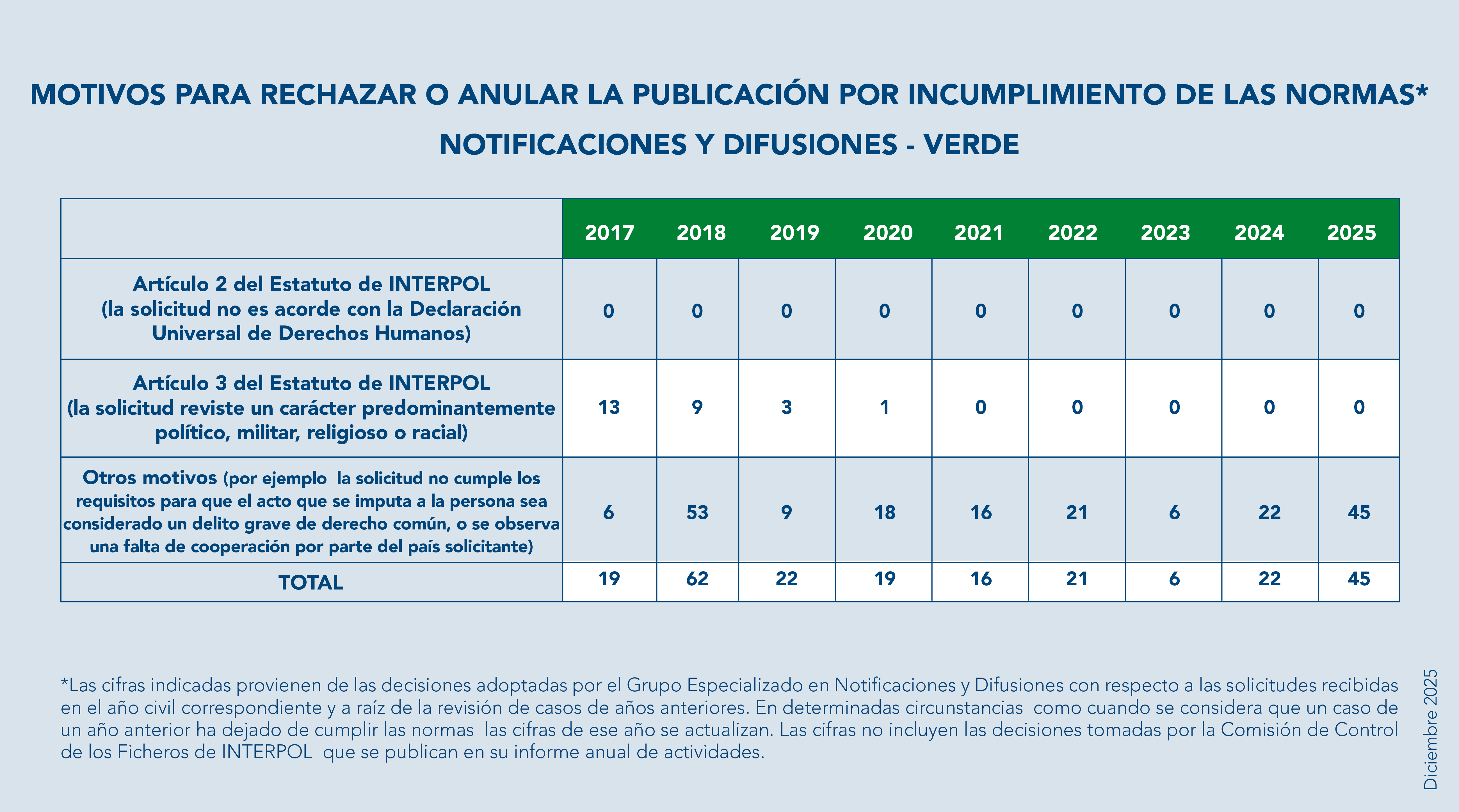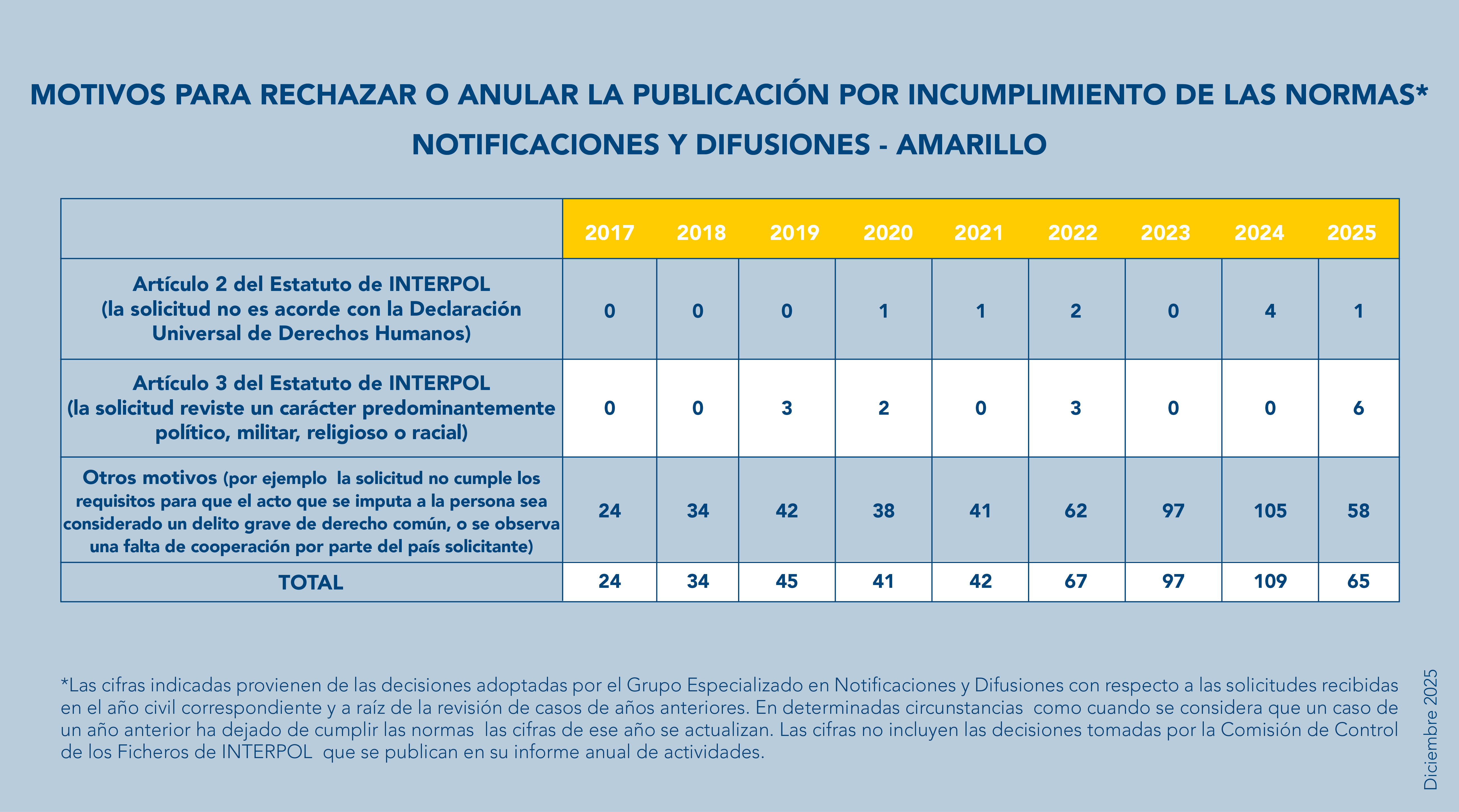 Si la solicitud de publicación de una notificación o difusión es rechazada por incumplimiento de los artículos 2 (1) o 3 del Estatuto de INTERPOL, no se permitirá proseguir la cooperación sobre el caso por conducto de INTERPOL. Una decisión del Grupo Especializado en Notificaciones y Difusiones de denegar la publicación de una notificación o difusión no afecta a la validez de los procedimientos penales del país solicitante, como tampoco impide que la cooperación internacional continúe por canales ajenos a INTERPOL.