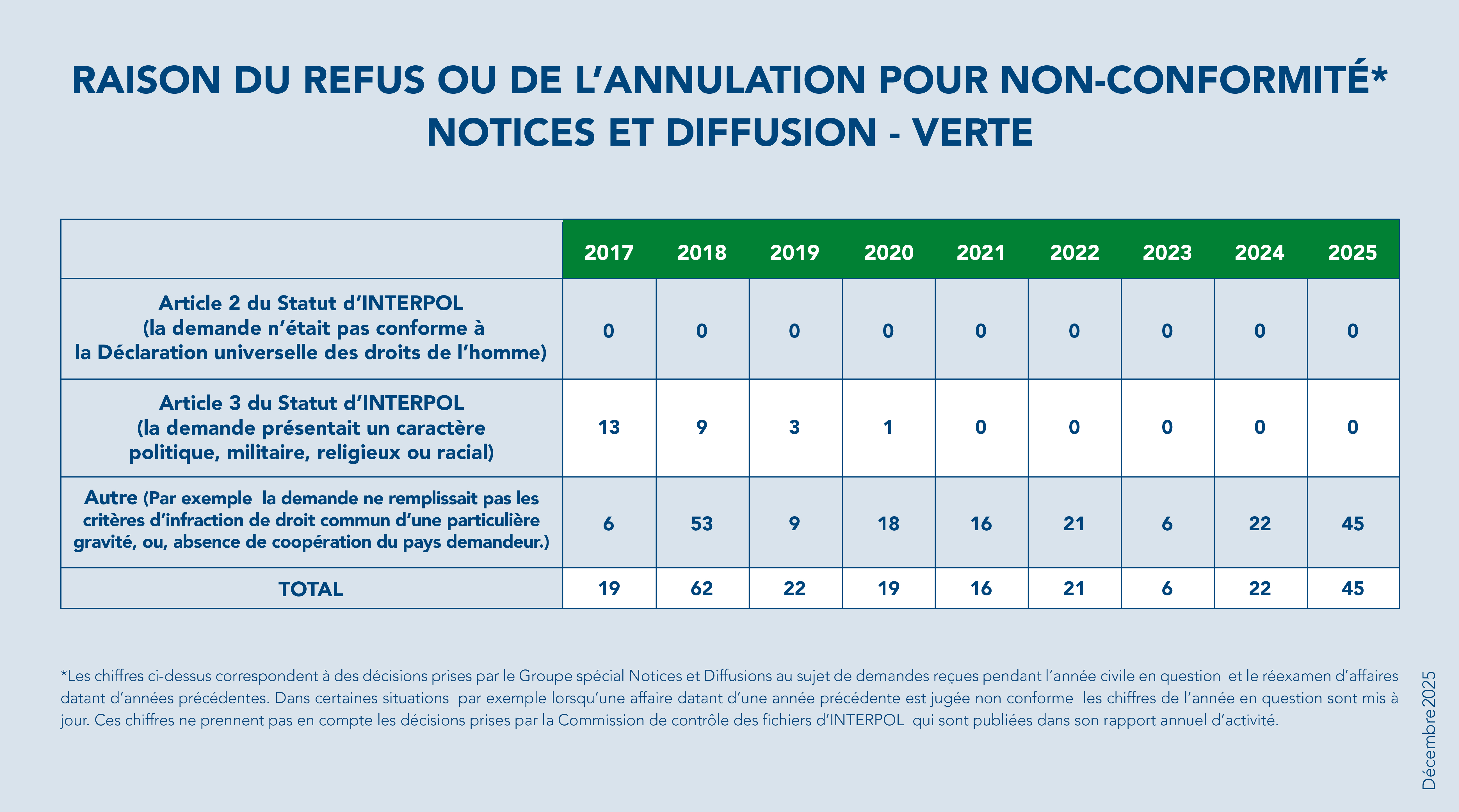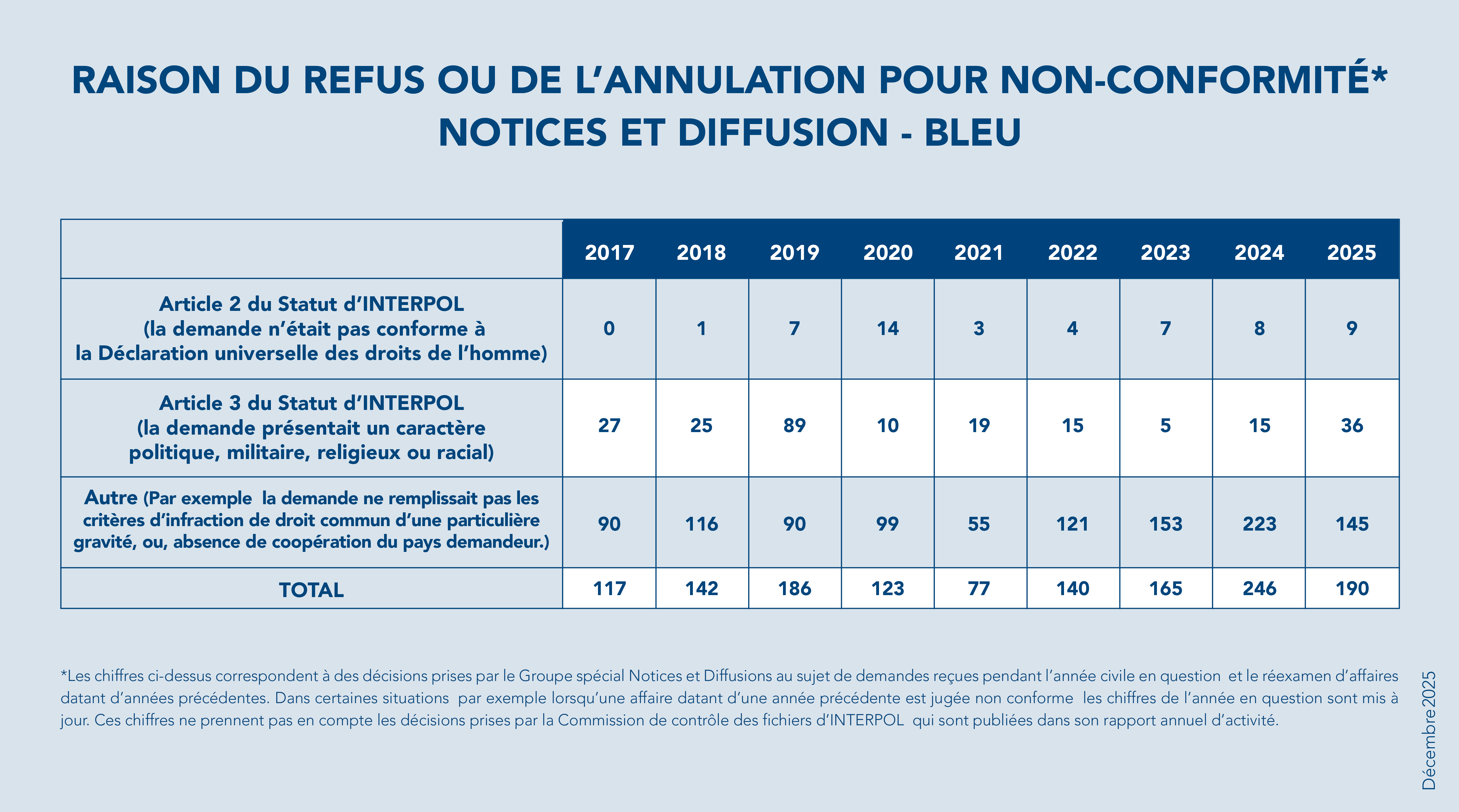 - D’autres informations issues des bases de données d’INTERPOL, d’échanges avec les pays membres ou de sources externes et qui sont susceptibles d’indiquer une non-conformité – par exemple des éléments selon lesquels la personne faisant l’objet d’une notice s’est vu accorder le statut de réfugié dans un autre pays.